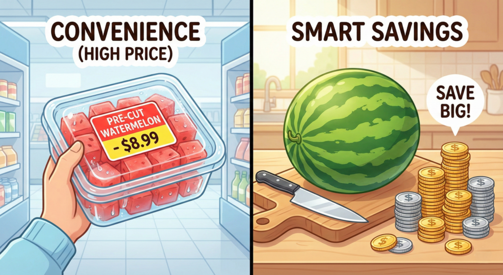 Supermarkets know you are busy. They profit from your exhaustion by offering pre-cut vegetables, pre-shredded cheese, and marinated meats. This is the “convenience tax.”