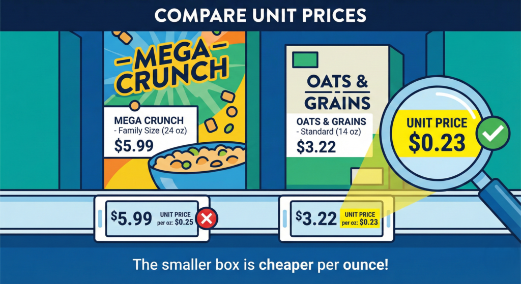 Supermarkets are designed to trick you. They use bright “SALE” signs on big packages to make you think you’re getting a deal. But a bigger box isn’t always cheaper.